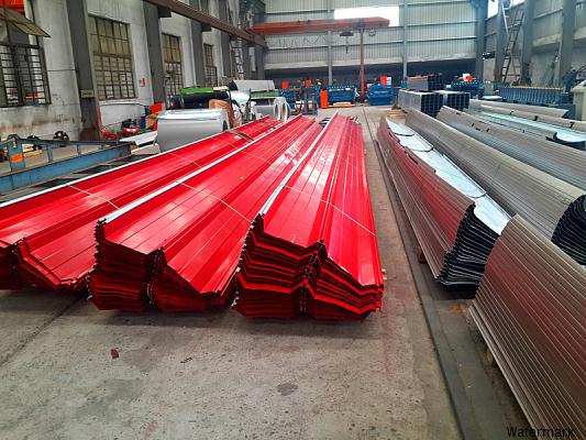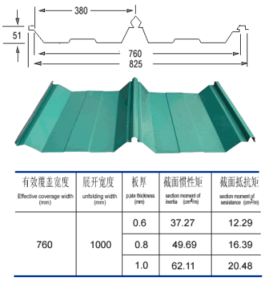 角驰ⅢYX51-380-760 YW51-380-760压型板解决了常规系列压型板的屋面渗漏问题,压型板的连接打破了传统屋面用螺栓连接的惯例,安装方法采用180度锁口咬合安装,使屋面防水效果更加完好。 该压型板属咬口屋面板,具有波峰高、强度大、无螺钉